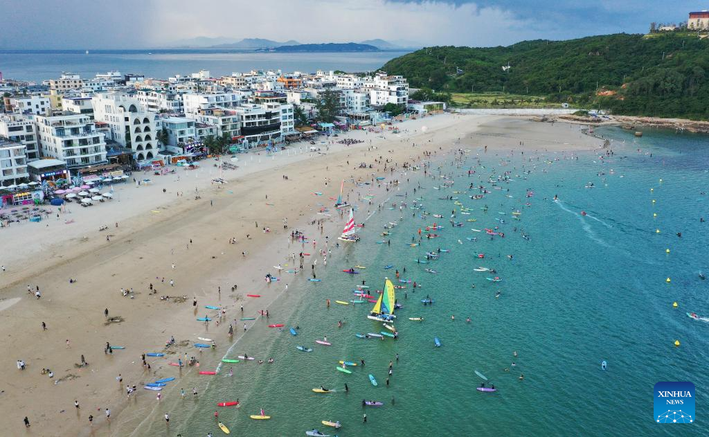An aerial drone photo taken on Aug. 9, 2025 shows tourists surfing on a beach in Sanya City, south China's Hainan Province. Tourists are flocking to Sanya for the pleasure of surfing during the summer vacation. (Xinhua/Guo Cheng)