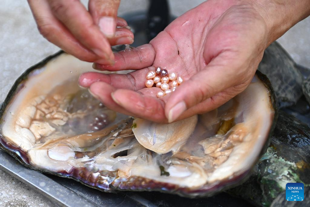 A worker opens a mussel to retrieve pearls in Shanxiahu Town, Zhuji City of east China's Zhejiang Province, Aug. 9, 2025. Shanxiahu Town of Zhejiang Province is renowned for its pearl industry that ranges from pearl farming, processing, trading to cultural tourism.