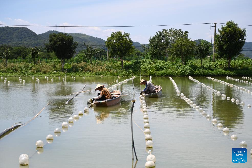 Workers release mussels at a smart pearl farming base in Shanxiahu Town, Zhuji City of east China's Zhejiang Province, Aug. 9, 2025. Shanxiahu Town of Zhejiang Province is renowned for its pearl industry that ranges from pearl farming, processing, trading to cultural tourism.