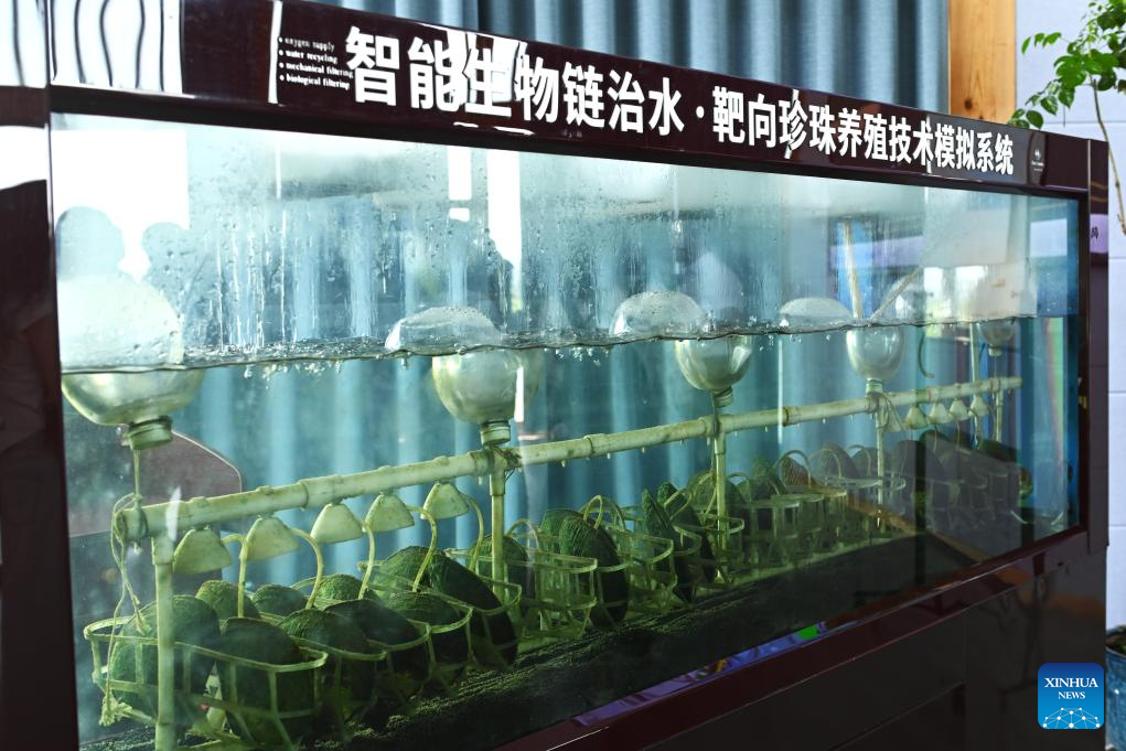 This photo taken on Aug. 9, 2025 shows a simulated pearl farming system in Shanxiahu Town, Zhuji City of east China's Zhejiang Province. Shanxiahu Town of Zhejiang Province is renowned for its pearl industry that ranges from pearl farming, processing, trading to cultural tourism.