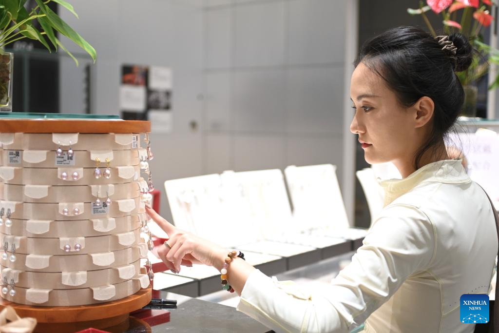 A customer selects pearl jewelry at a trading center for jewelry products in Shanxiahu Town, Zhuji City of east China's Zhejiang Province, Aug. 9, 2025. Shanxiahu Town of Zhejiang Province is renowned for its pearl industry that ranges from pearl farming, processing, trading to cultural tourism.