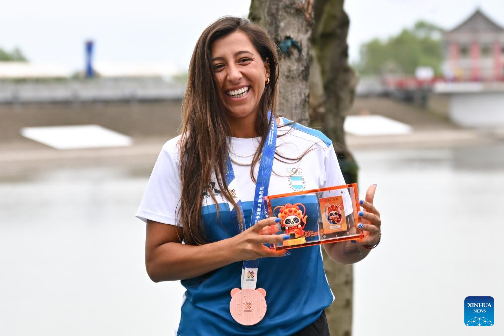 Bronze medalist Eugenia de Armas of Argentina reacts during the awarding ceremony for the women's wakeboard freestyle of Waterski & Wakeboard event at The World Games 2025 in Chengdu, southwest China's Sichuan Province, Aug. 10, 2025. (Xinhua/Chen Zhenhai)
