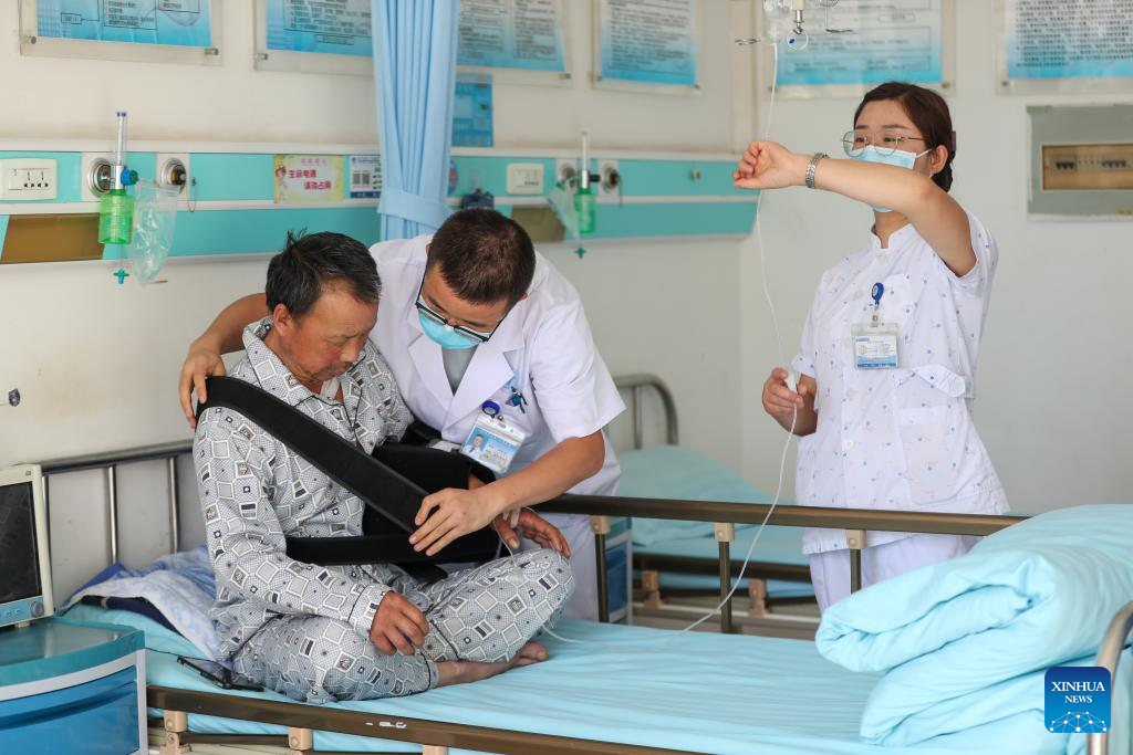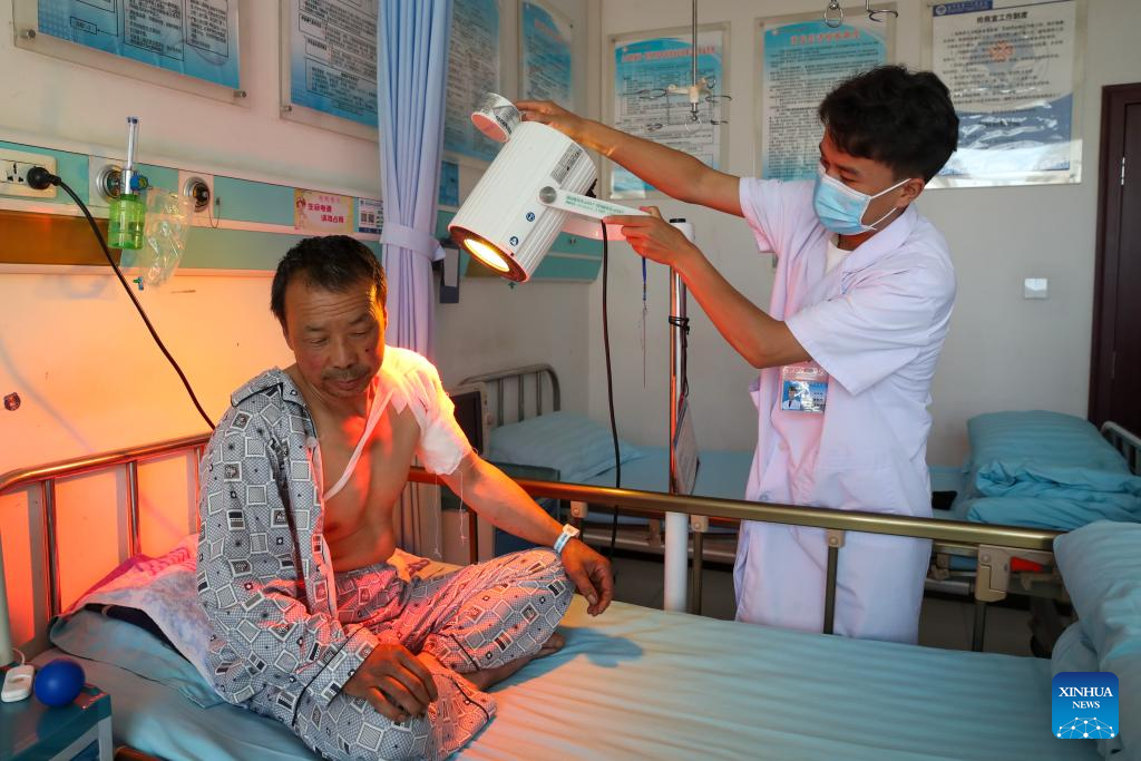 A medical worker (R) performs physical therapy for an injured at the first people's hospital of Yuzhong County, in Yuzhong, Lanzhou City, northwest China's Gansu Province, Aug. 11, 2025. Since the mountain torrents occurred in Yuzhong County, the provincial health department has dispatched 26 medical experts to the first people's hospital of the county to guide the treatment of the injured. At present, all the 15 injured people, who have been transferred to the hospitals at the provincial and county levels for treatment, have been out of danger. (Xinhua/Lang Bingbing)