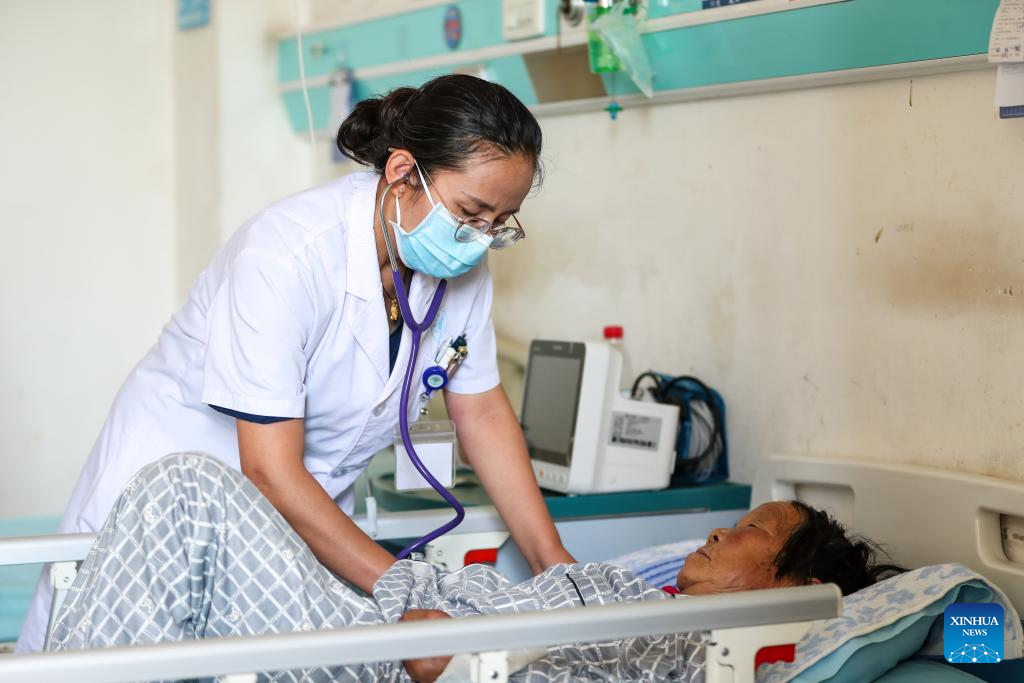 A doctor (L) exams an injured at the first people's hospital of Yuzhong County, in Yuzhong, Lanzhou City, northwest China's Gansu Province, Aug. 11, 2025. Since the mountain torrents occurred in Yuzhong County, the provincial health department has dispatched 26 medical experts to the first people's hospital of the county to guide the treatment of the injured. At present, all the 15 injured people, who have been transferred to the hospitals at the provincial and county levels for treatment, have been out of danger. (Xinhua/Lang Bingbing)