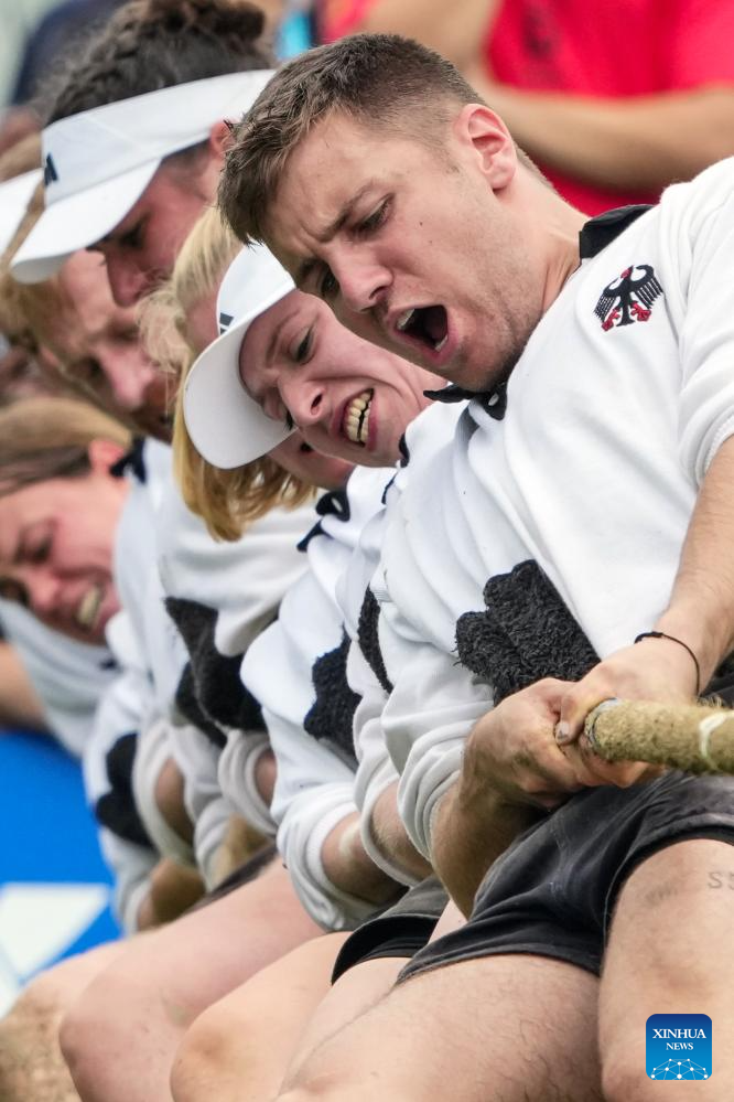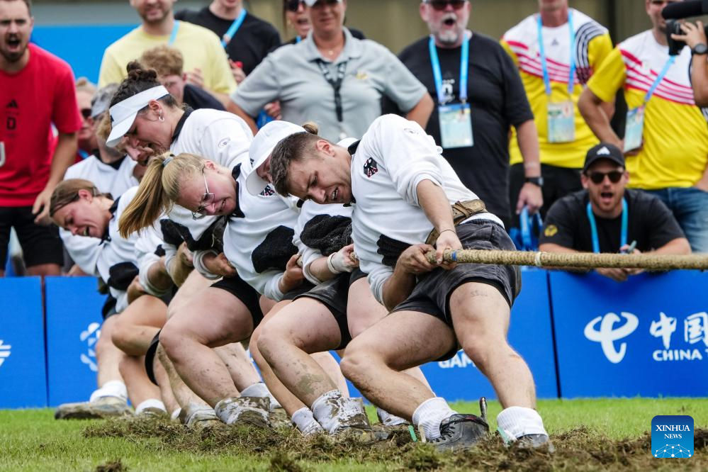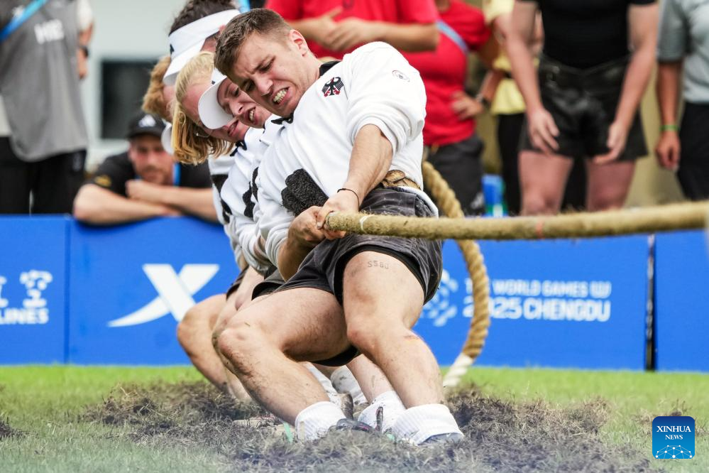 Team Germany compete during the Mixed Outdoor 580kg Bronze Medal Match between Germany and Italy of Tug of War event at The World Games 2025 in Chengdu, southwest China's Sichuan Province, Aug. 11, 2025. (Xinhua/Li Bo)