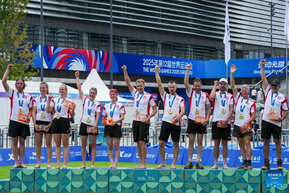 Gold medalists team Switzerland celebrate during the victory ceremony for the Mixed Outdoor 580kg competition of Tug of War event at The World Games 2025 in Chengdu, southwest China's Sichuan Province, Aug. 11, 2025. (Xinhua/Li Bo)