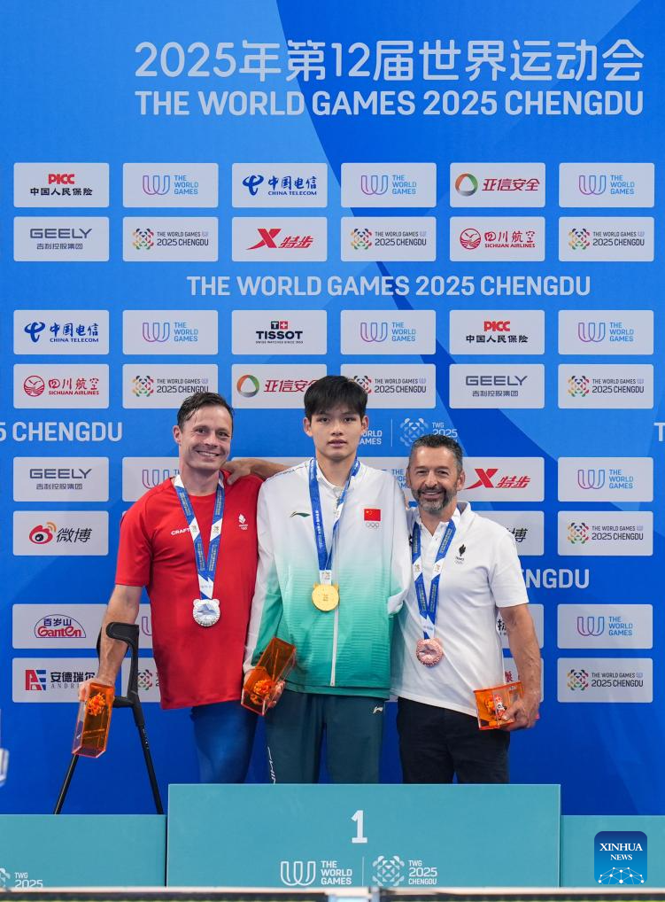Gold medalist Long Dengxi (C) of China, silver medalist Casper Marti-Beckmann (L) of Denmark and bronze medalist Alexandre Boscari of France attend the victory ceremony for the Men's Dynamic with Fins - FFS1-FFS2 Final of the Freediving event at The World Games 2025 in Chengdu, southwest China's Sichuan Province, Aug. 11, 2025. (Xinhua/Wang Xi)