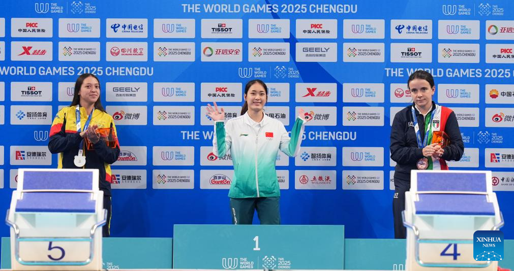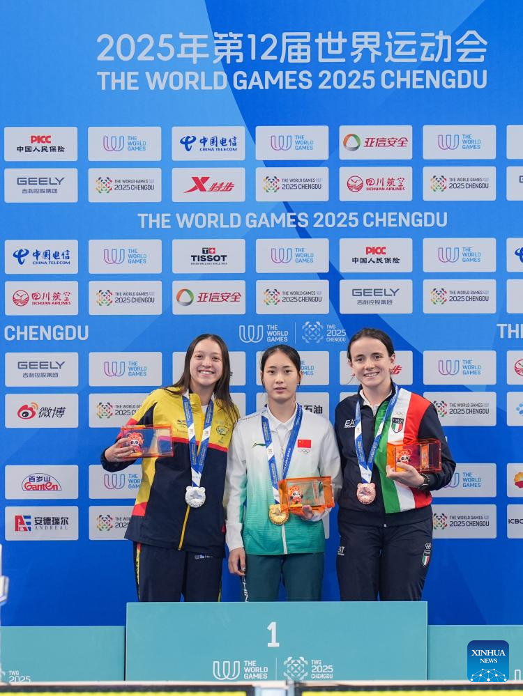 Gold medalist Huang Jingqiu (C) of China, silver medalist Maria Carolina Rodriguez Angarita (L) of Colombia and bronze medalist Marta Pozzi of Italy pose during the victory ceremony for the Women's Dynamic without Fins - FFS1-FFS2 Final of the Freediving event at The World Games 2025 in Chengdu, southwest China's Sichuan Province, Aug. 11, 2025. (Xinhua/Wang Xi)