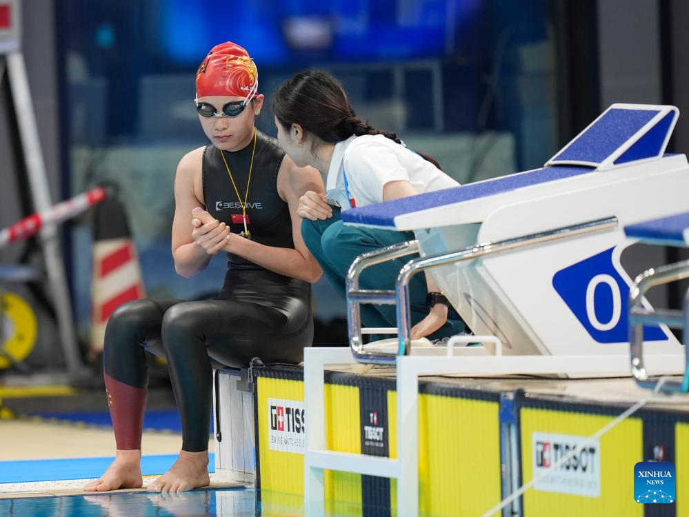 Huang Jingqiu of China prepares before the Women's Dynamic without Fins - FFS1-FFS2 Final of the Freediving event at The World Games 2025 in Chengdu, southwest China's Sichuan Province, Aug. 11, 2025. (Xinhua/Wang Xi)