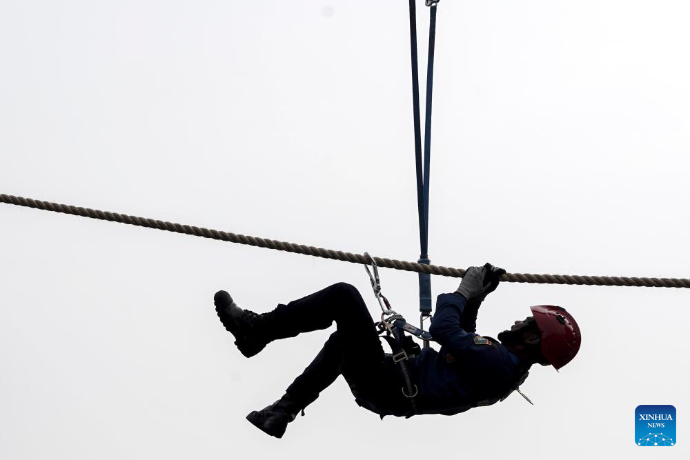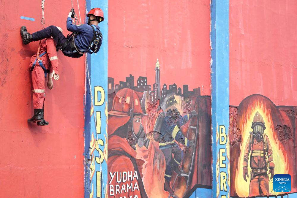 A firefighter participates in a competition at the Jakarta Fire Fighter Challenge (JFFC) 2025 in Jakarta, Indonesia, Aug. 11, 2025. (Photo by B. Nugraha/Xinhua)