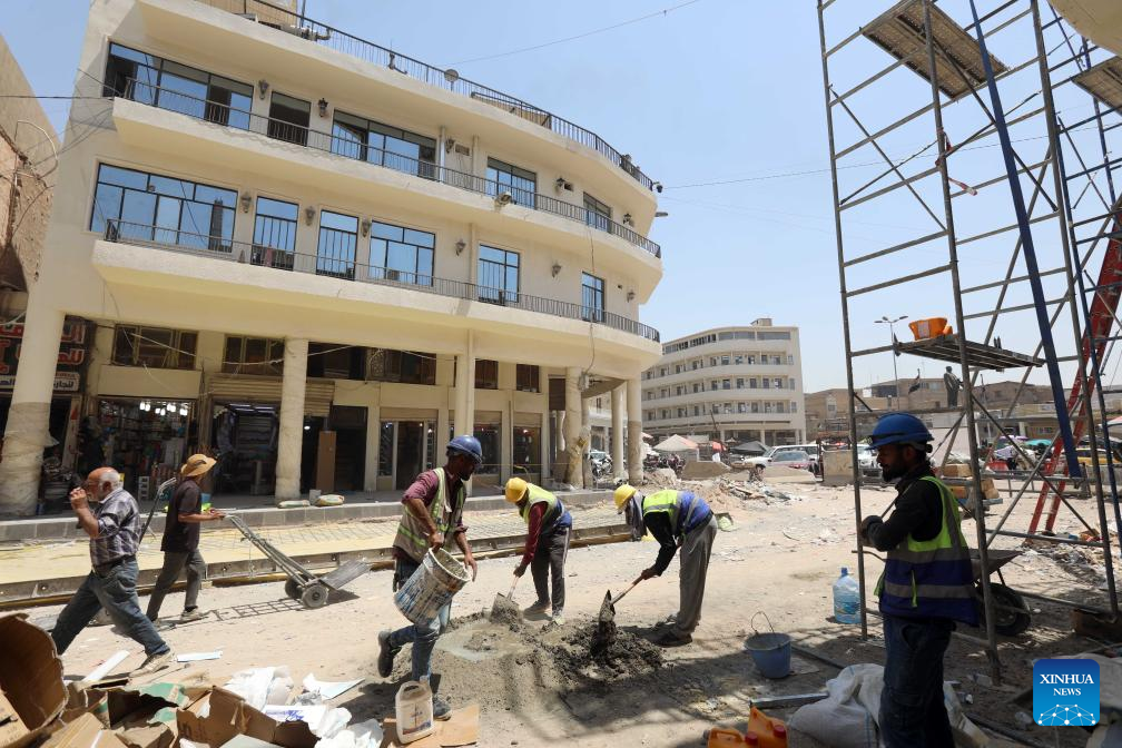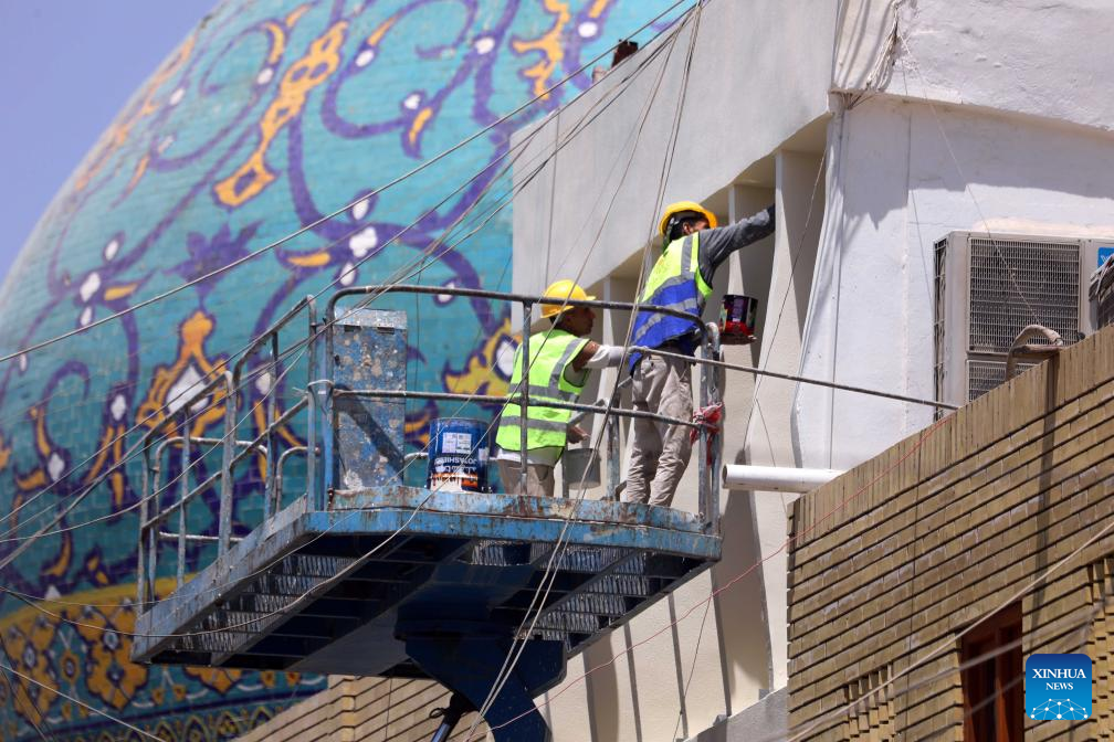 BAGHDAD, Aug. 11 (Xinhua) -- Under Baghdad's searing sun, workers in reflective vests scrub decades of grime from the windows of historic buildings lining al-Rashid Street. Scaffolding clings to weathered facades as artisans revive intricate Islamic patterns on forgotten balconies, a testament to the tireless effort to resurrect Baghdad's most iconic thoroughfare.