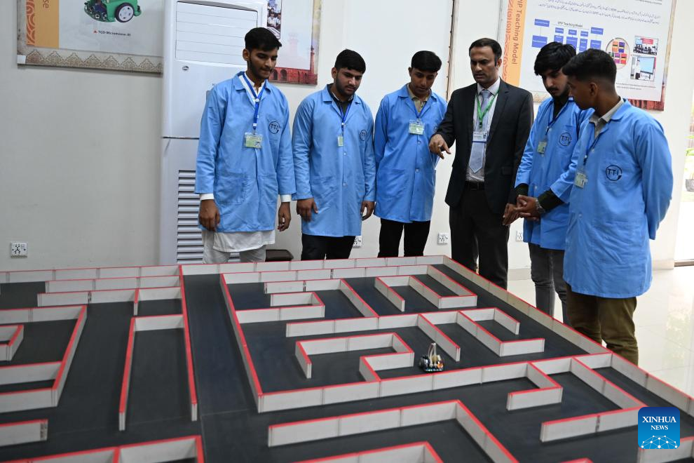 A teacher briefs students about a robot at the Luban Workshop in Lahore, Pakistan, Aug. 4, 2025. The Luban Workshop provides modern training labs, equipment and digital learning platforms in line with the Chinese technical standards, having trained over 1,000 students so far. (Xinhua/Ahmad Kamal)