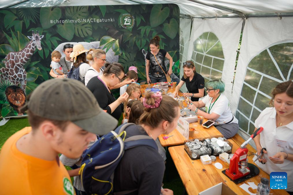 Staff members make handicrafts with children during World Elephant Day events at the Warsaw Zoo in Warsaw, Poland on Aug. 12, 2025. The zoo's elephant house held special activities on Tuesday to mark the World Elephant Day. (Photo by Jaap Arriens/Xinhua)