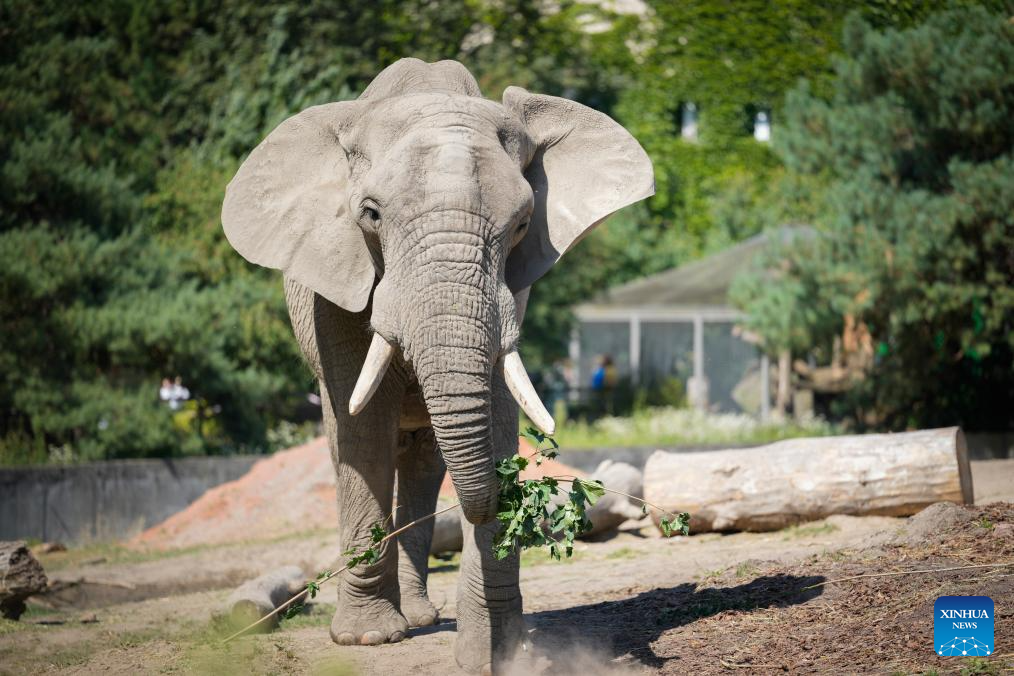 An elephant eats at the Warsaw Zoo in Warsaw, Poland on Aug. 12, 2025. The zoo's elephant house held special activities on Tuesday to mark the World Elephant Day. (Photo by Jaap Arriens/Xinhua)
