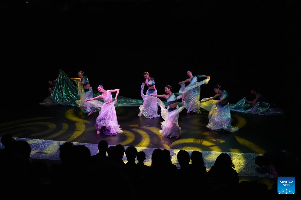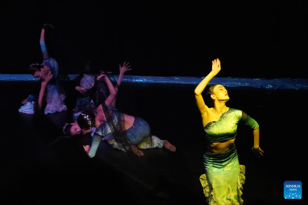 Dancers from Shanghai Theatre Academy perform dance drama The Pure Blue during Edinburgh Art Festival in Edinburgh, Britain, Aug. 11, 2025. (Xinhua/Zheng Bofei)