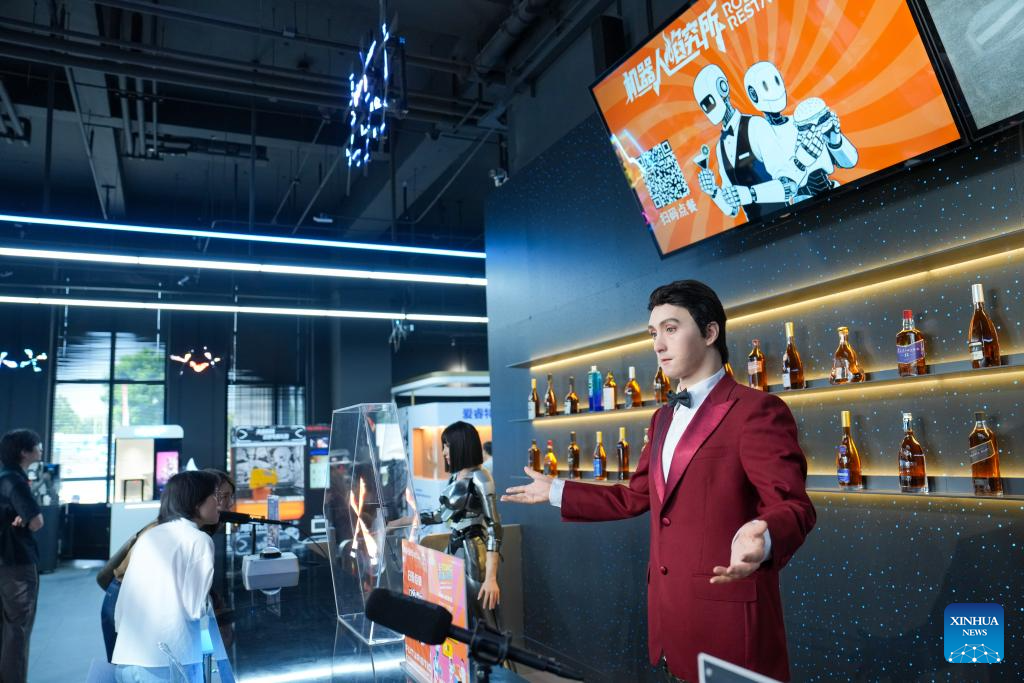 A humanoid robot welcomes customers at a themed restaurant in Beijing, capital of China, Aug. 6, 2025. The 2025 World Robot Conference (WRC) showcases rapidly advancing embodied intelligence technology, with humanoid robots as the highlight, demonstrating significant progress achieved globally and particularly in China, while the event also serves to illuminate a wide range of future commercial application scenarios.