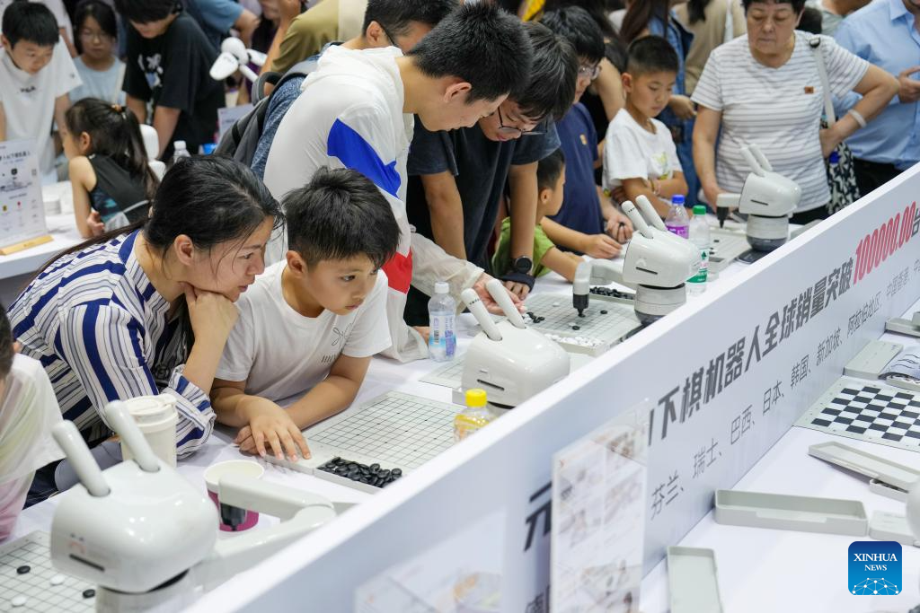 Children play chess with robots during the 2025 World Robot Conference (WRC) in Beijing, capital of China, Aug. 11, 2025. The WRC 2025 showcases rapidly advancing embodied intelligence technology, with humanoid robots as the highlight, demonstrating significant progress achieved globally and particularly in China, while the event also serves to illuminate a wide range of future commercial application scenarios.