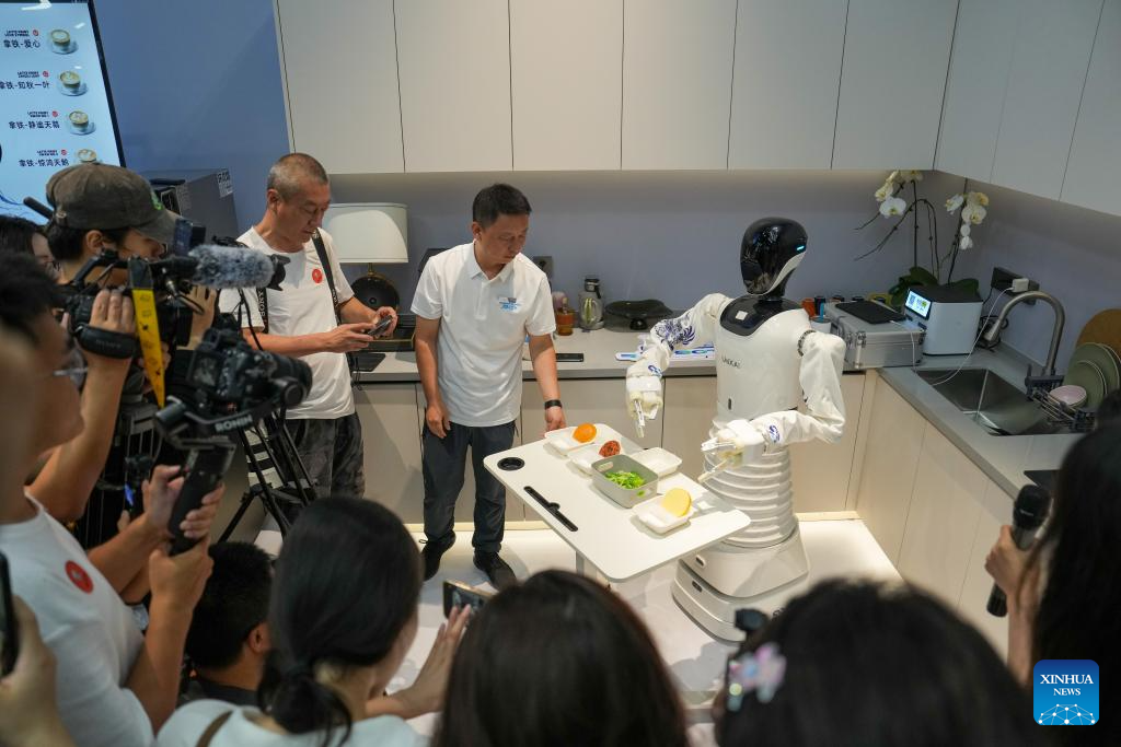 A robot displays cooking skills at a robot mall in Beijing, capital of China, Aug. 6, 2025. The 2025 World Robot Conference (WRC) showcases rapidly advancing embodied intelligence technology, with humanoid robots as the highlight, demonstrating significant progress achieved globally and particularly in China, while the event also serves to illuminate a wide range of future commercial application scenarios.