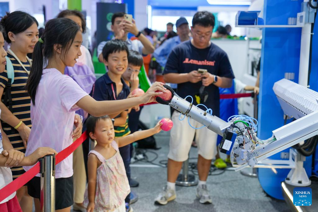 Children interact with a fruit-picking robot during the 2025 World Robot Conference (WRC) in Beijing, capital of China, Aug. 11, 2025. The WRC 2025 showcases rapidly advancing embodied intelligence technology, with humanoid robots as the highlight, demonstrating significant progress achieved globally and particularly in China, while the event also serves to illuminate a wide range of future commercial application scenarios.