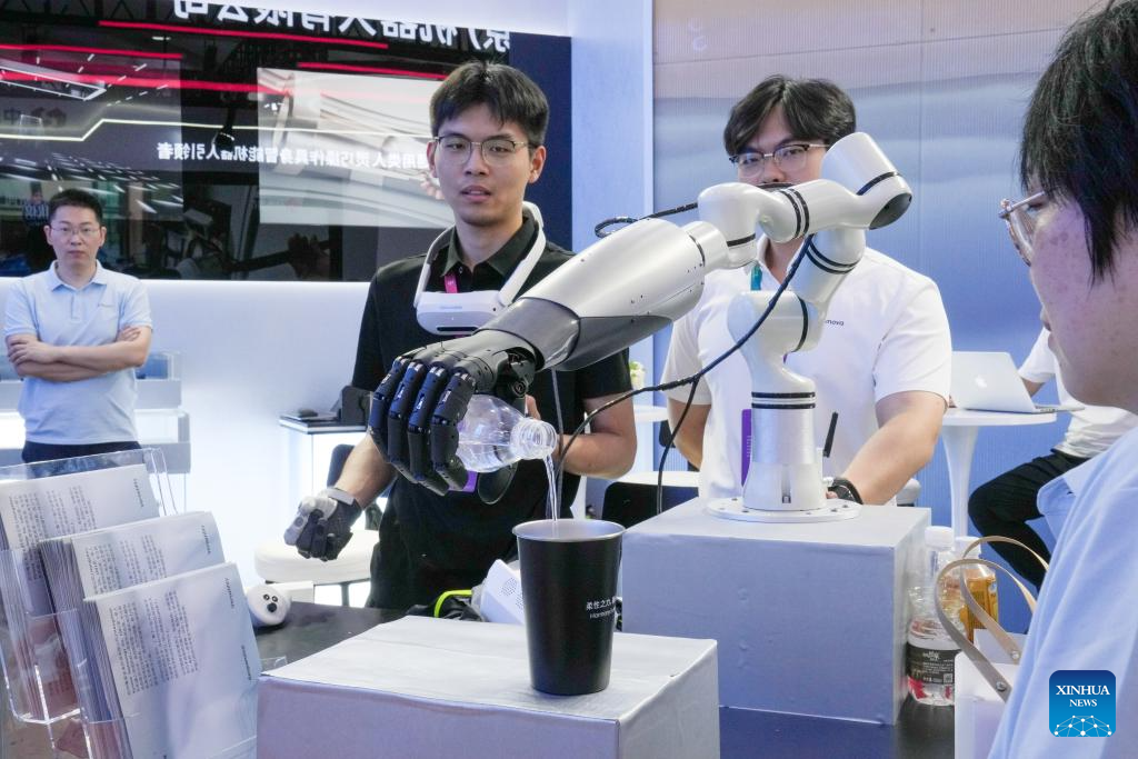 A mechanical hand pours water during the 2025 World Robot Conference (WRC) in Beijing, capital of China, Aug. 11, 2025. The WRC 2025 showcases rapidly advancing embodied intelligence technology, with humanoid robots as the highlight, demonstrating significant progress achieved globally and particularly in China, while the event also serves to illuminate a wide range of future commercial application scenarios.