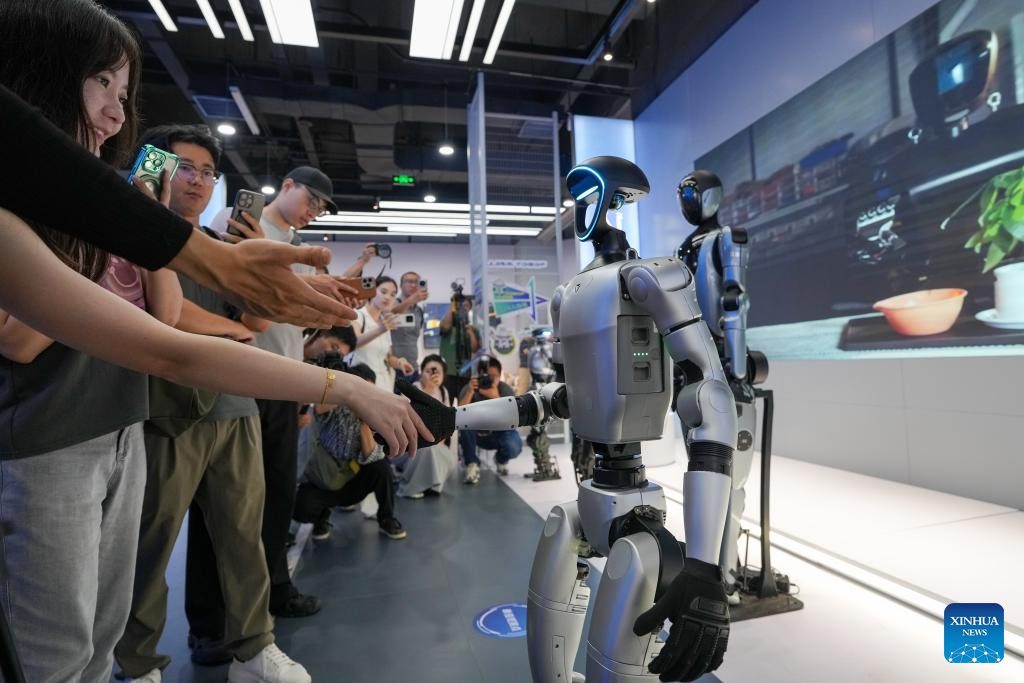 A humanoid robot shakes hands with visitors at a robot mall in Beijing, capital of China, Aug. 6, 2025. The 2025 World Robot Conference (WRC) showcases rapidly advancing embodied intelligence technology, with humanoid robots as the highlight, demonstrating significant progress achieved globally and particularly in China, while the event also serves to illuminate a wide range of future commercial application scenarios.