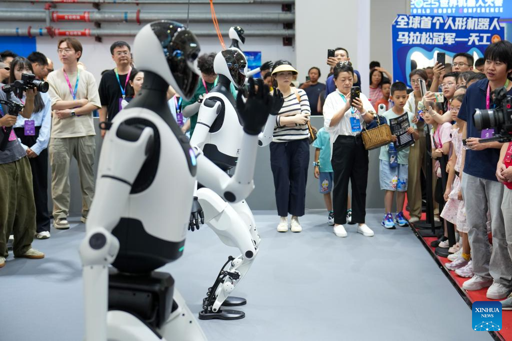 Humanoid robots perform at the 2025 World Robot Conference (WRC) in Beijing, capital of China, Aug. 11, 2025. The WRC 2025 showcases rapidly advancing embodied intelligence technology, with humanoid robots as the highlight, demonstrating significant progress achieved globally and particularly in China, while the event also serves to illuminate a wide range of future commercial application scenarios.