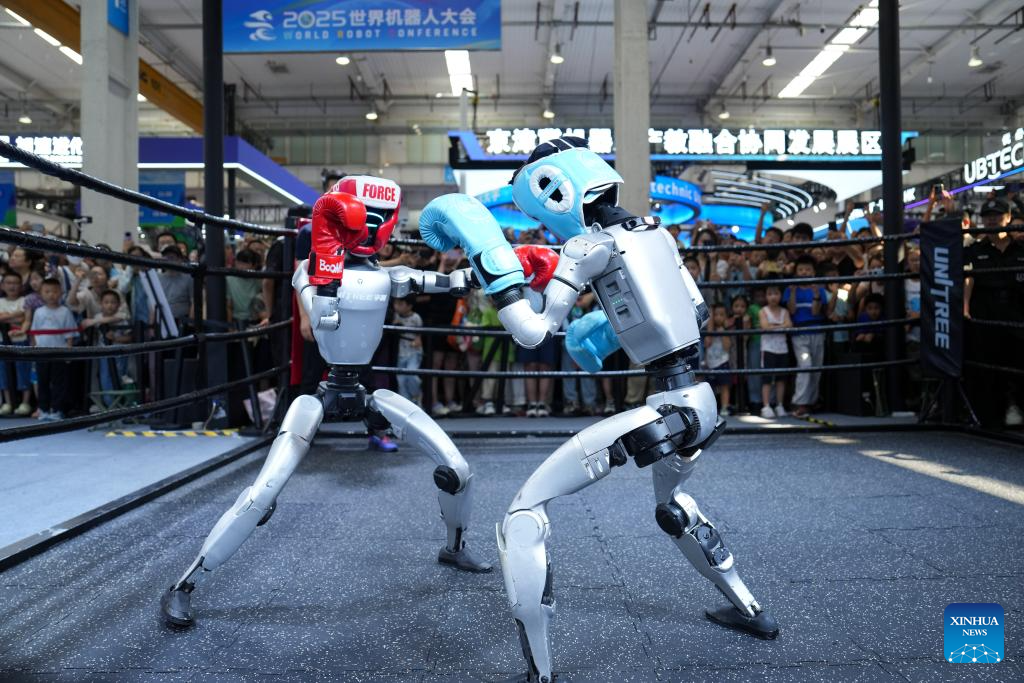 Robots compete in boxing at the booth of Unitree Robotics during the 2025 World Robot Conference (WRC) in Beijing, capital of China, Aug. 11, 2025. The WRC 2025 showcases rapidly advancing embodied intelligence technology, with humanoid robots as the highlight, demonstrating significant progress achieved globally and particularly in China, while the event also serves to illuminate a wide range of future commercial application scenarios.