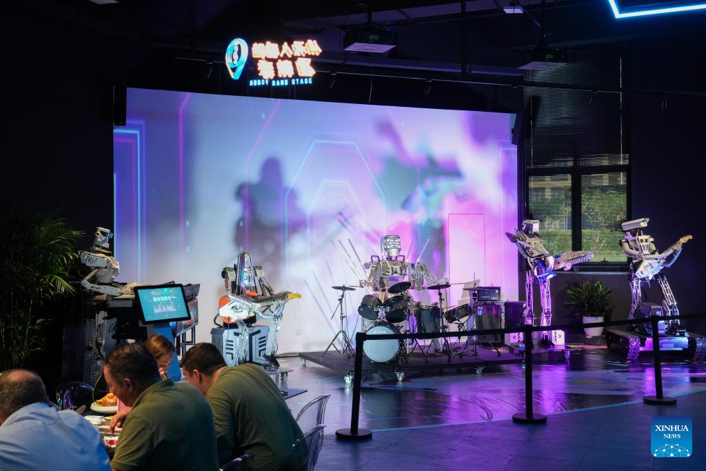 A robot band performs at a themed restaurant in Beijing, capital of China, Aug. 6, 2025. The 2025 World Robot Conference (WRC) showcases rapidly advancing embodied intelligence technology, with humanoid robots as the highlight, demonstrating significant progress achieved globally and particularly in China, while the event also serves to illuminate a wide range of future commercial application scenarios.