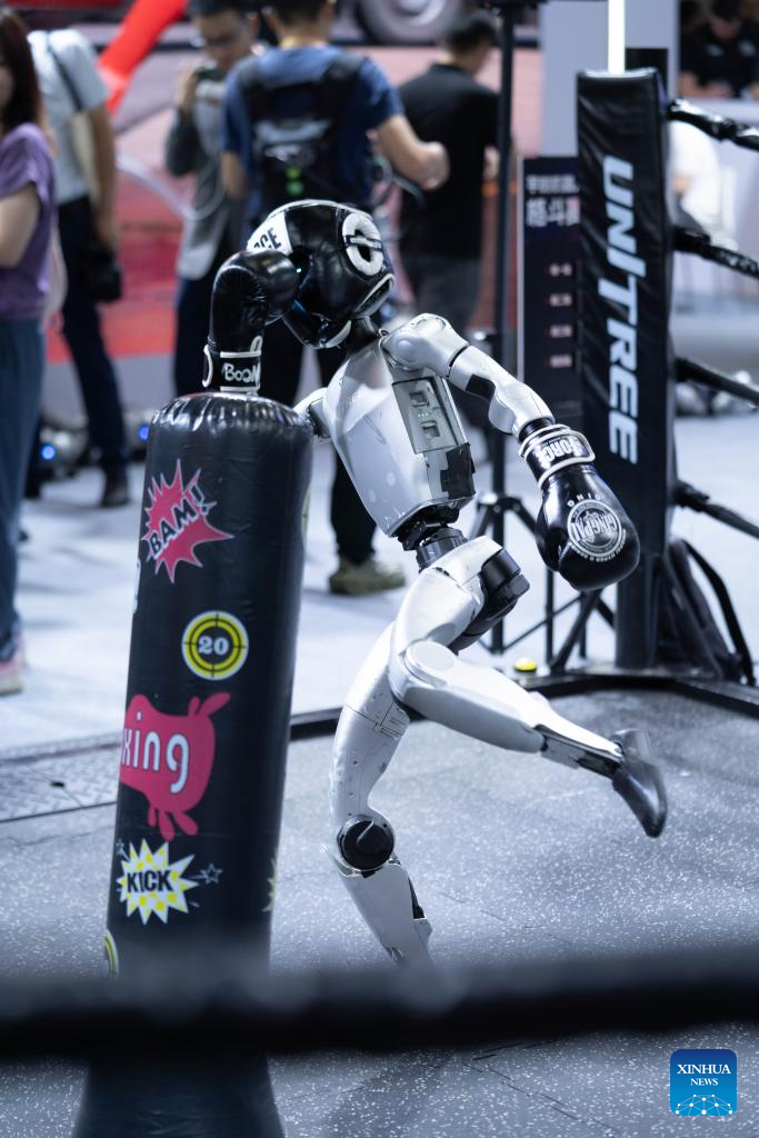 A robot competes in boxing at the booth of Unitree Robotics during the 2025 World Robot Conference (WRC) in Beijing, capital of China, Aug. 11, 2025. The WRC 2025 showcases rapidly advancing embodied intelligence technology, with humanoid robots as the highlight, demonstrating significant progress achieved globally and particularly in China, while the event also serves to illuminate a wide range of future commercial application scenarios.