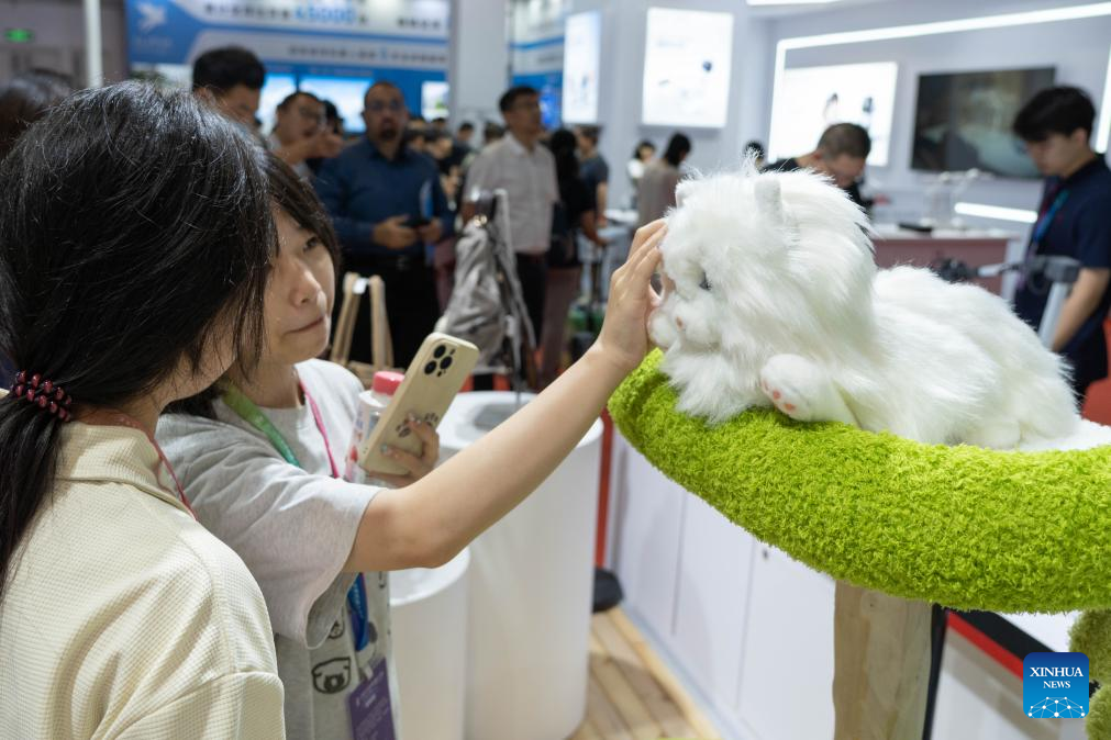 A girl interacts with a robot pet at the 2025 World Robot Conference (WRC) in Beijing, capital of China, Aug. 8, 2025. The WRC 2025 showcases rapidly advancing embodied intelligence technology, with humanoid robots as the highlight, demonstrating significant progress achieved globally and particularly in China, while the event also serves to illuminate a wide range of future commercial application scenarios.