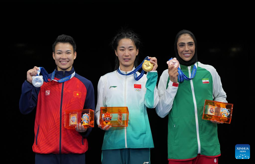 In the women's 70kg sanda final, China's Zhu Hailan won the first round but lost the next two to Iran's Seyedah Yasaman Bagherzadehvaskas, who took the gold.