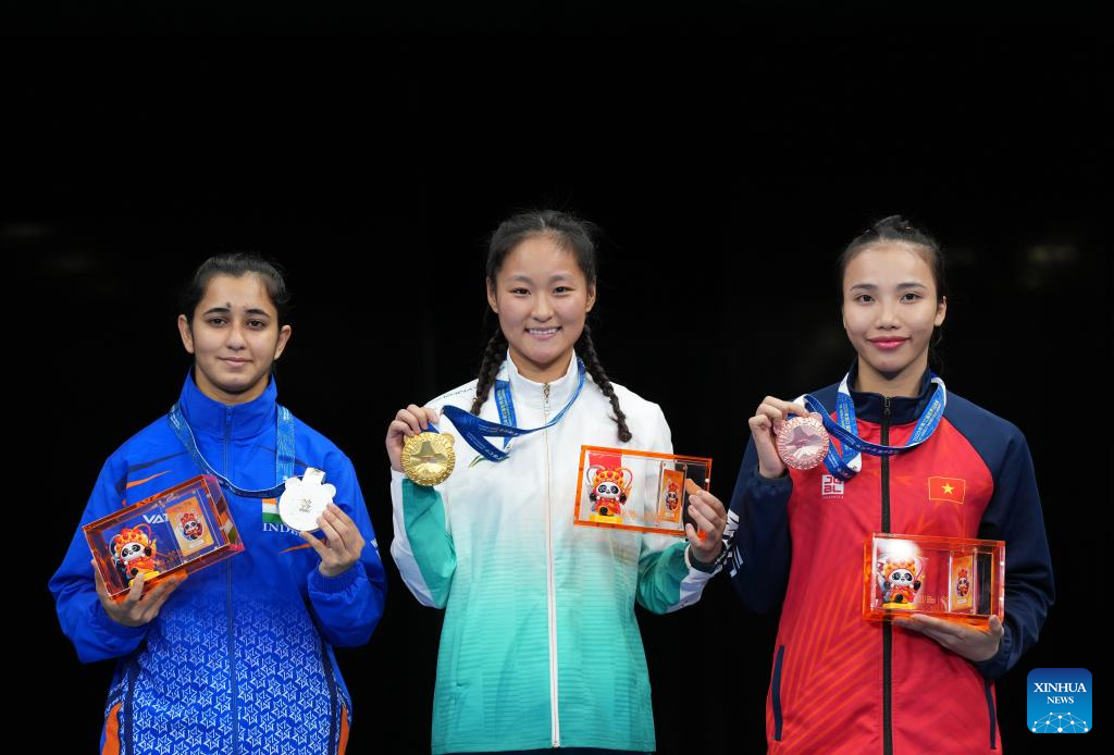 Gold medalist Chen Mengyue (C) of China, silver medalist Namrata Batra (L) of India and bronze medalist Ngo Thi Phuong Nga of Vietnam pose during the Women's Sanda -52kg awarding ceremony of Wushu event at The World Games 2025 in Chengdu, southwest China's Sichuan Province, Aug. 12, 2025. (Xinhua/Xu Suhui)
