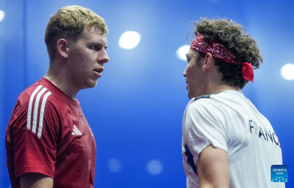 Victor Crouin (R) competes during the Men's Singles Finals Gold Medal Match between Victor Crouin of France and Balazs Farkas of Hungary of Squash event at The World Games 2025 in Chengdu, southwest China's Sichuan Province, Aug. 12, 2025. (Xinhua/Wu Huiwo)