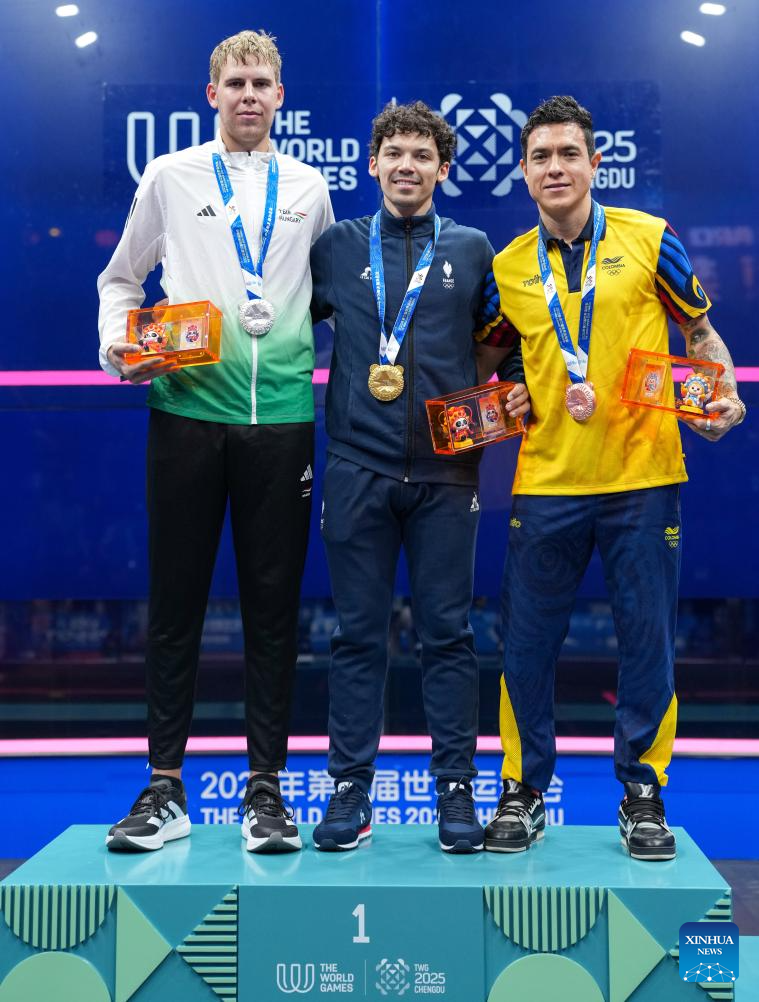 Gold medalist Victor Crouin (C) of France, silver medalist Balazs Farkas (L) of Hungary and bronze medalist Miguel Rodriguez of Colombia pose during the awarding ceremony for the Men's Singles Match of Squash event at The World Games 2025 in Chengdu, southwest China's Sichuan Province, Aug. 12, 2025. (Xinhua/Li Xulun)