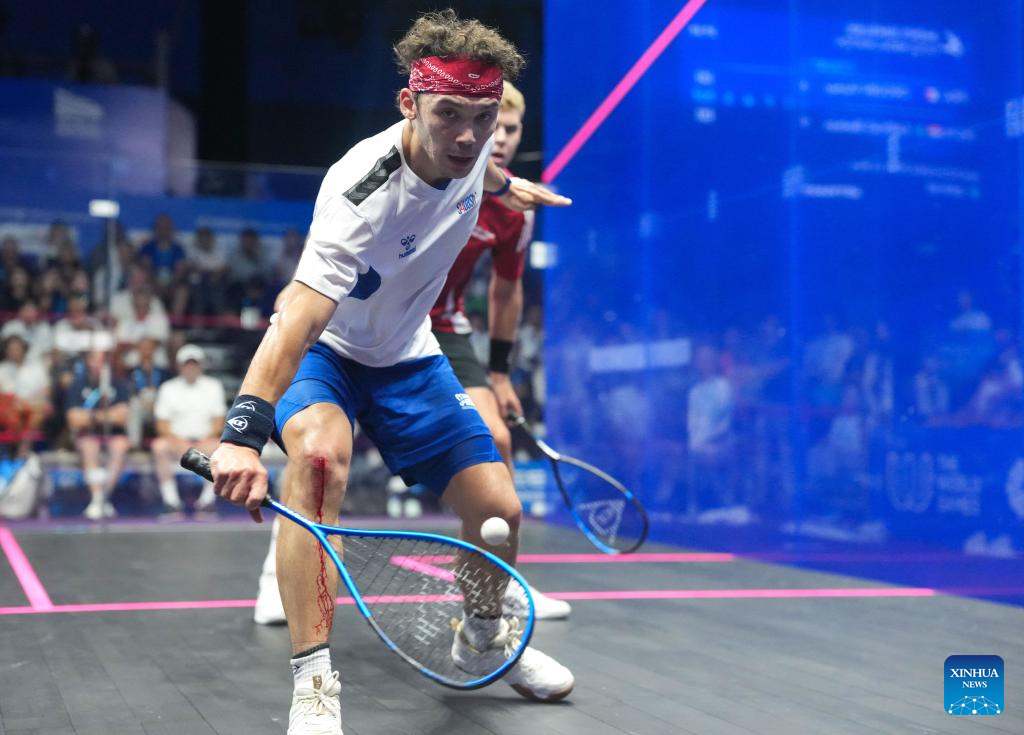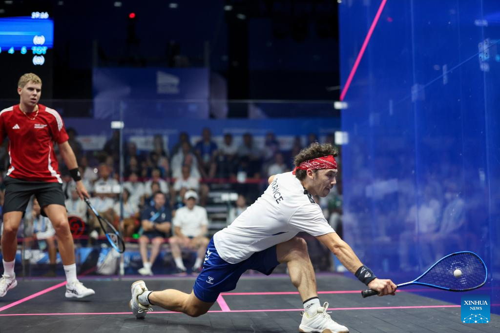 Victor Crouin competes during the Men's Singles Finals Gold Medal Match between Victor Crouin of France and Balazs Farkas of Hungary of Squash event at The World Games 2025 in Chengdu, southwest China's Sichuan Province, Aug. 12, 2025. (Xinhua/Li Xulun)