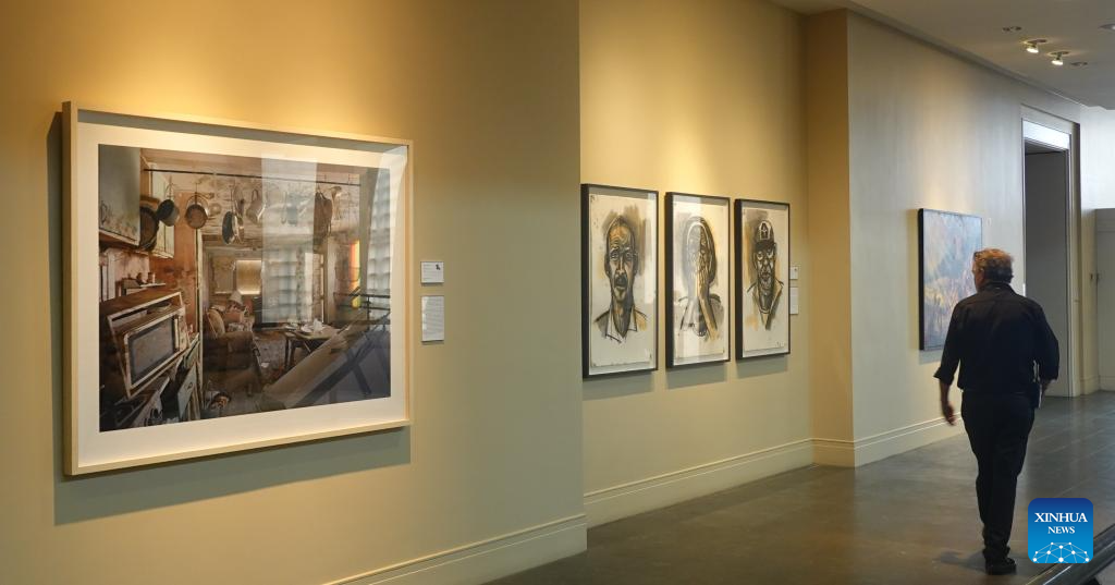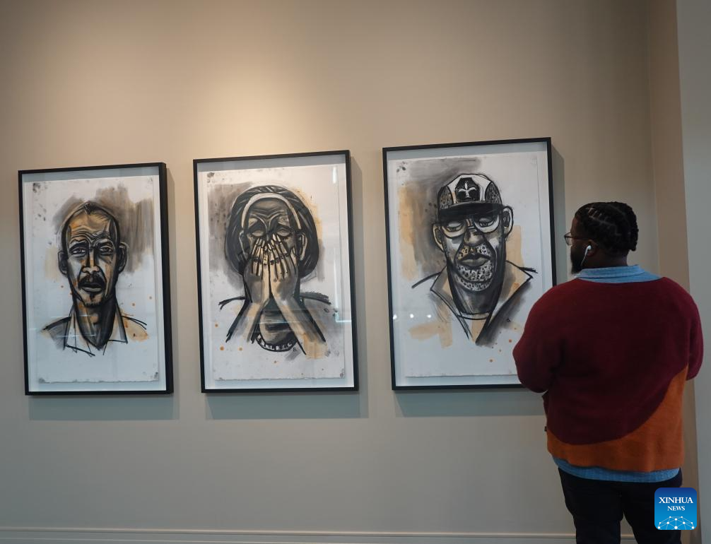 A visitor looks at artworks during an exhibition remembering the 20th anniversary of Hurricane Katrina in Ogden Museum of Southern Art, New Orleans, the United States, on Aug. 11, 2025.