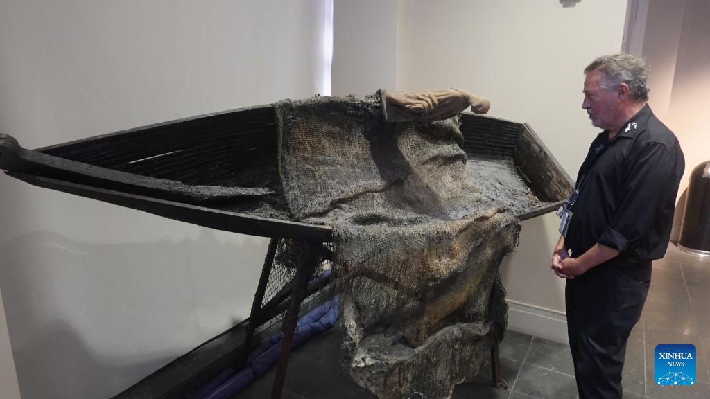 Curator Bradley Sumrall introduces an artwork at the exhibition remembering the 20th anniversary of Hurricane Katrina in Ogden Museum of Southern Art, New Orleans, the United States, on Aug. 11, 2025.