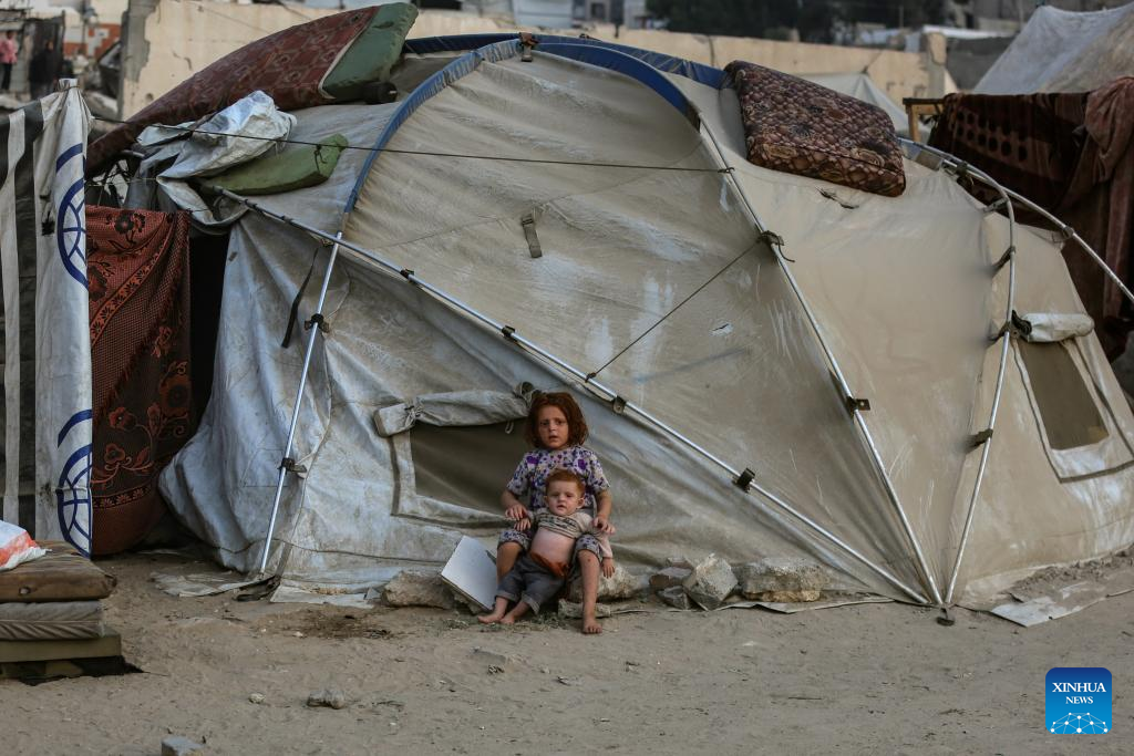 Children sit in front of a tent for displaced Palestinians near a beach in Gaza City, on Aug. 10, 2025. (Photo by Rizek Abdeljawad/Xinhua)