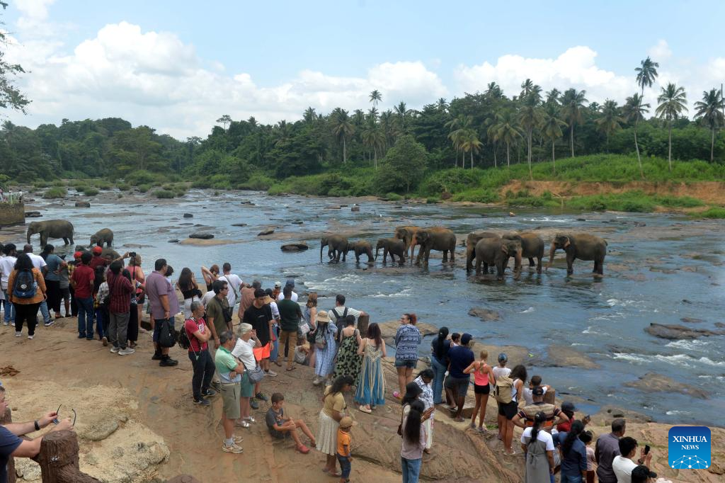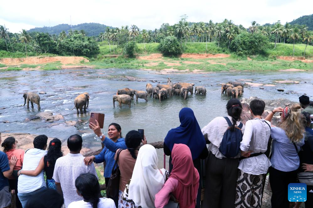 Tourists view elephants at the Pinnawala Elephant Orphanage in Sri Lanka, Aug. 10, 2025. Since its establishment in 1975, the elephant orphanage has adopted many orphaned and injured elephants. World Elephant Day falls on Aug. 12 each year. (Photo by Gayan Sameera/Xinhua)
