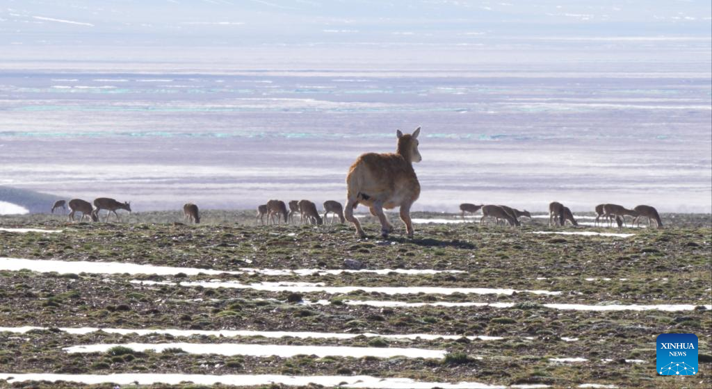 XINING, Aug. 12 (Xinhua) -- As the afternoon sets in, the sun begins to warm the Qinghai-Tibet Plateau, making it the peak time for Tibetan antelopes to search for food. After a night without eating, these creatures dot the hillsides near Zonag Lake in the Hoh Xil National Nature Reserve.