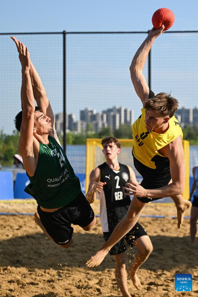 Lennart Liebeck (R) of Germany competes during the Beach Handball Men's Final Match between Portugal and Germany at The World Games 2025 in Chengdu, southwest China's Sichuan Province, Aug. 12, 2025. (Xinhua/Chen Zhenhai)