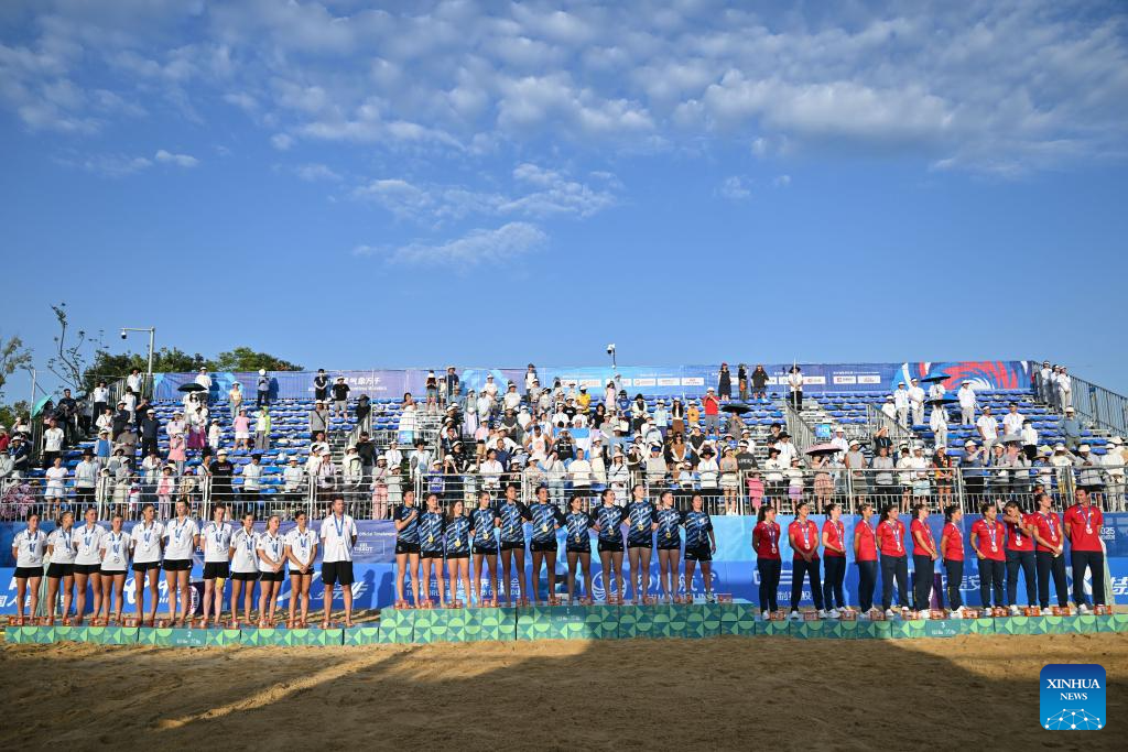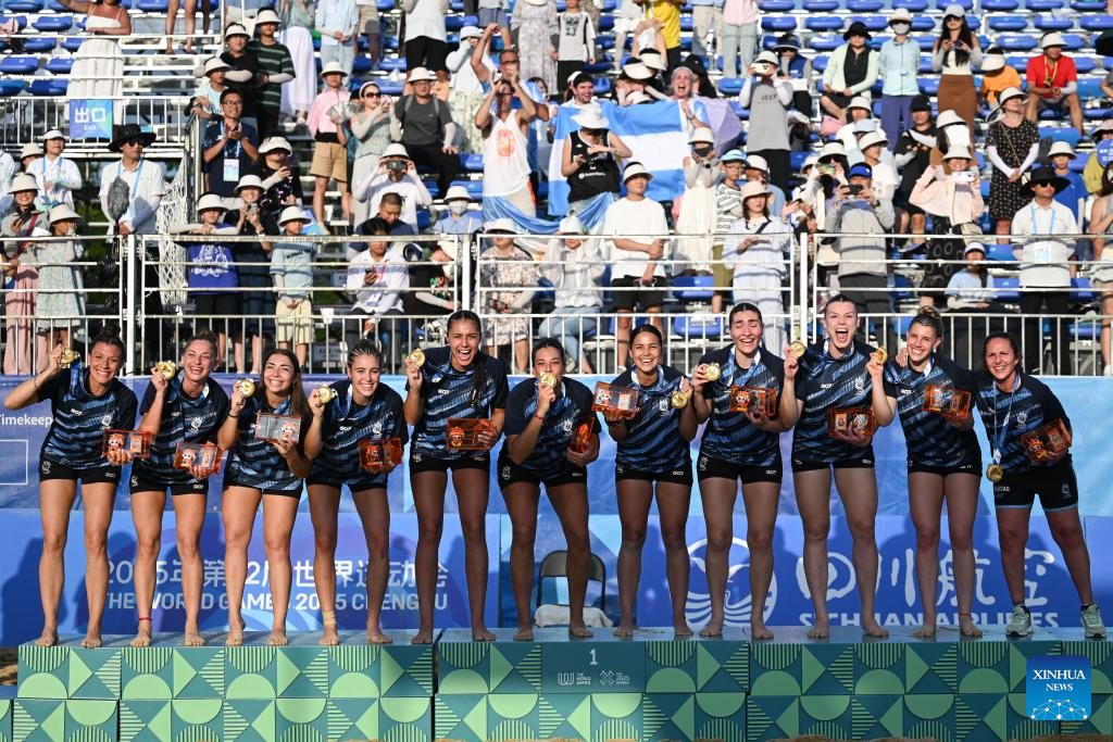 Gold medalists team Argentina pose during the awarding ceremony for the Women's Beach Handball event at The World Games 2025 in Chengdu, southwest China's Sichuan Province, Aug. 12, 2025. (Xinhua/Chen Zhenhai)