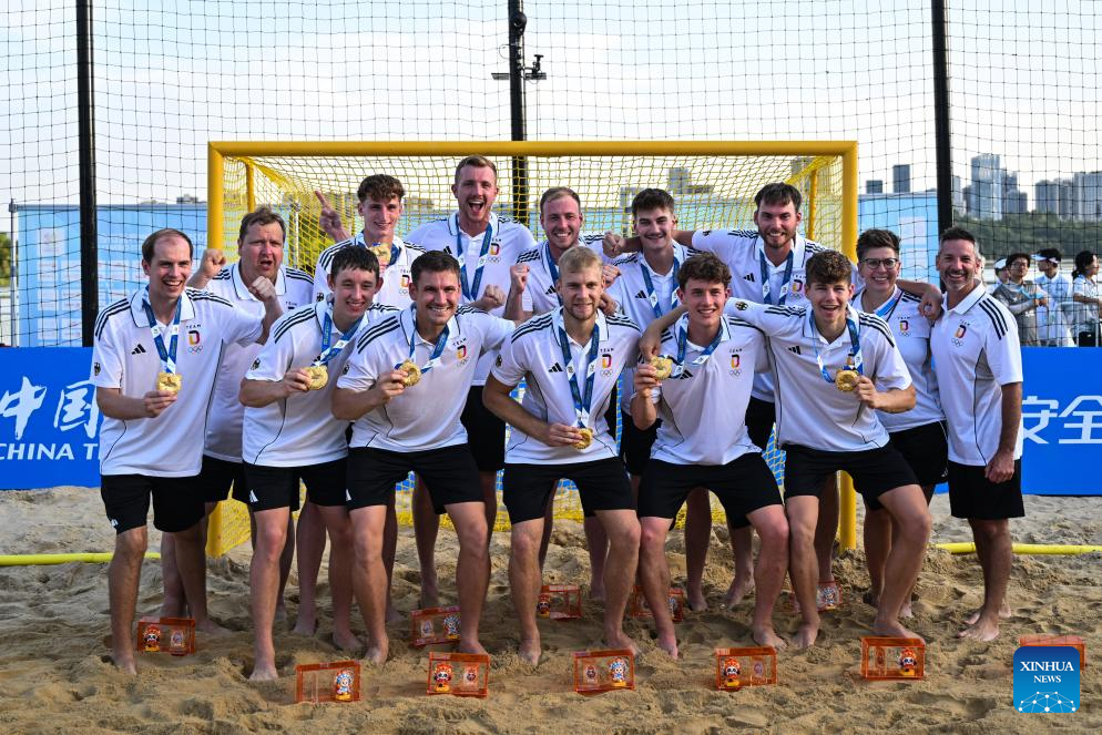 Gold medalists team Germany pose during the awarding ceremony for the Beach Handball Men's Final at The World Games 2025 in Chengdu, southwest China's Sichuan Province, Aug. 12, 2025. (Xinhua/Chen Zhenhai)