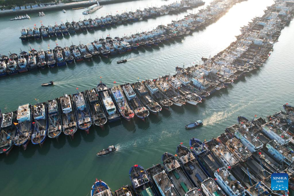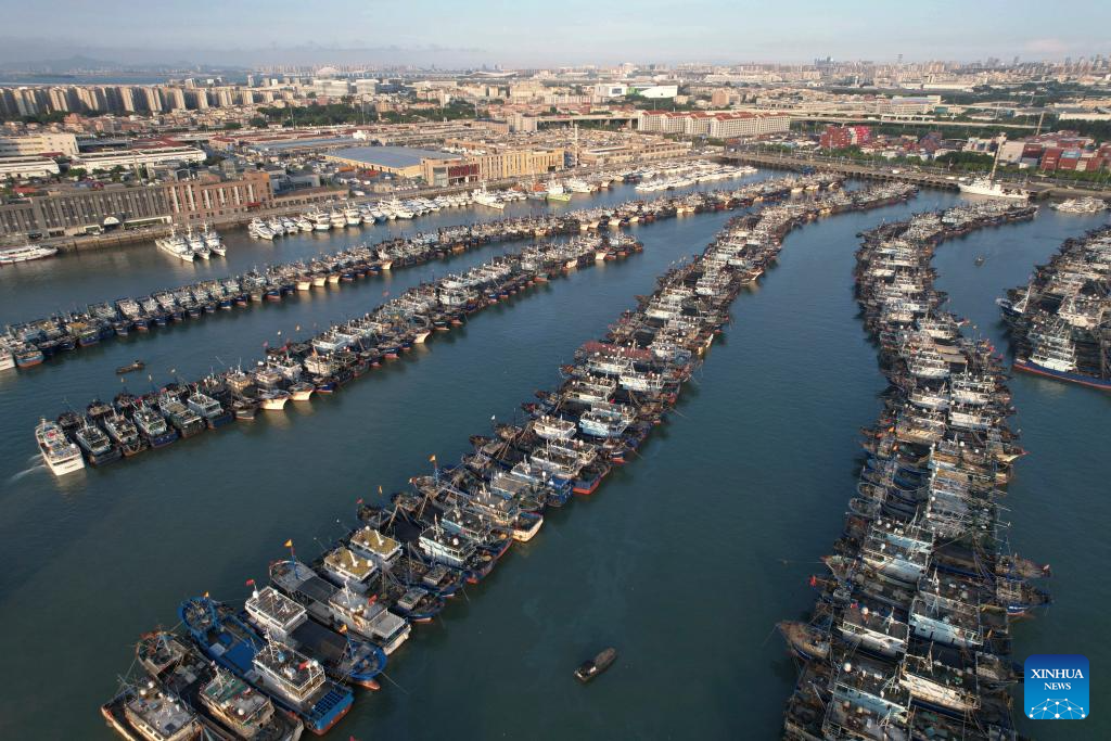 An aerial drone photo taken on Aug. 12, 2025 shows vessels anchoring at a port to take shelter from Typhoon Podul in Xiamen, southeast China's Fujian Province. At 6 p.m. Tuesday, the flood control headquarters in east China's Fujian Province upgraded its emergency typhoon response from Level IV to Level III, anticipating the arrival of Typhoon Podul. (Photo by Zeng Demeng/Xinhua)