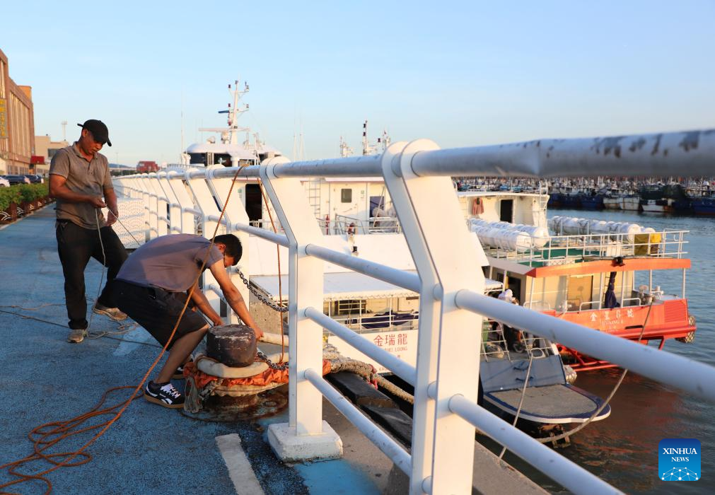 Sailors secure ropes of the vessel to defend against Typhoon Podul at a port in Xiamen, southeast China's Fujian Province, Aug. 12, 2025. At 6 p.m. Tuesday, the flood control headquarters in east China's Fujian Province upgraded its emergency typhoon response from Level IV to Level III, anticipating the arrival of Typhoon Podul. (Photo by Zeng Demeng/Xinhua)