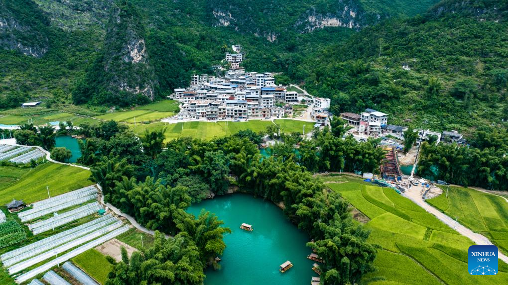 An aerial drone photo taken on Aug. 12, 2025 shows a view of the Daxiaojing scenic spot in Luodian County, southwest China's Guizhou Province. Luodian County in recent years has continuously upgraded its infrastructure and optimized its tourism service system, transforming its abundant mountain and water resources into tourist attractions. (Xinhua/Tao Liang)