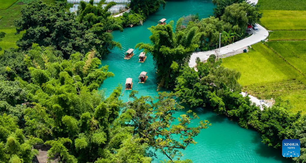 An aerial drone photo taken on Aug. 12, 2025 shows tourists taking boat tours at the Daxiaojing scenic spot in Luodian County, southwest China's Guizhou Province. Luodian County in recent years has continuously upgraded its infrastructure and optimized its tourism service system, transforming its abundant mountain and water resources into tourist attractions. (Xinhua/Tao Liang)