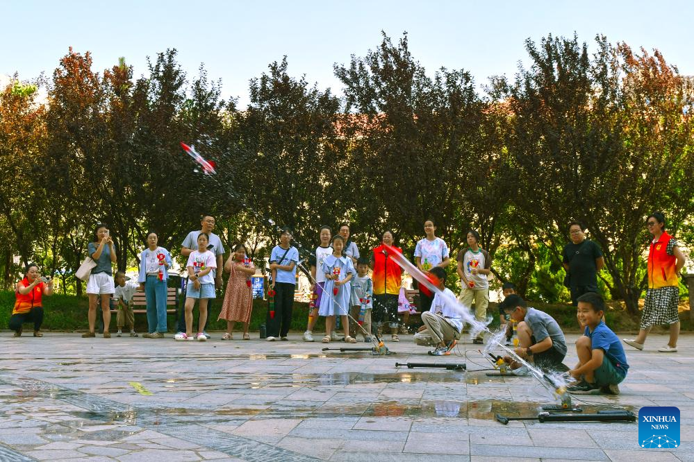 Children launch "water rockets" during a community science class in Yantai, east China's Shandong Province, Aug. 12, 2025. Children across China take part in various kinds of activities to spend their summer holiday. (Photo by Sun Wentan/Xinhua)
