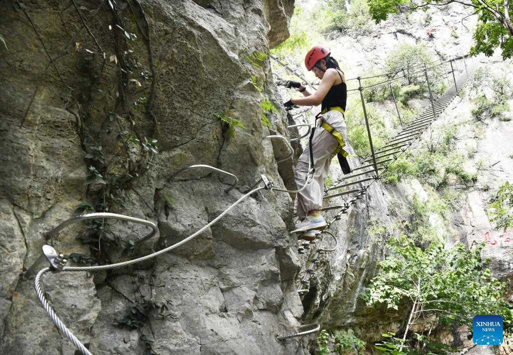 A child experiences a rock climbing activity in Zaozhuang, east China's Shandong Province, Aug. 12, 2025. Children across China take part in various kinds of activities to spend their summer holiday. (Photo by Li Zongxian/Xinhua)