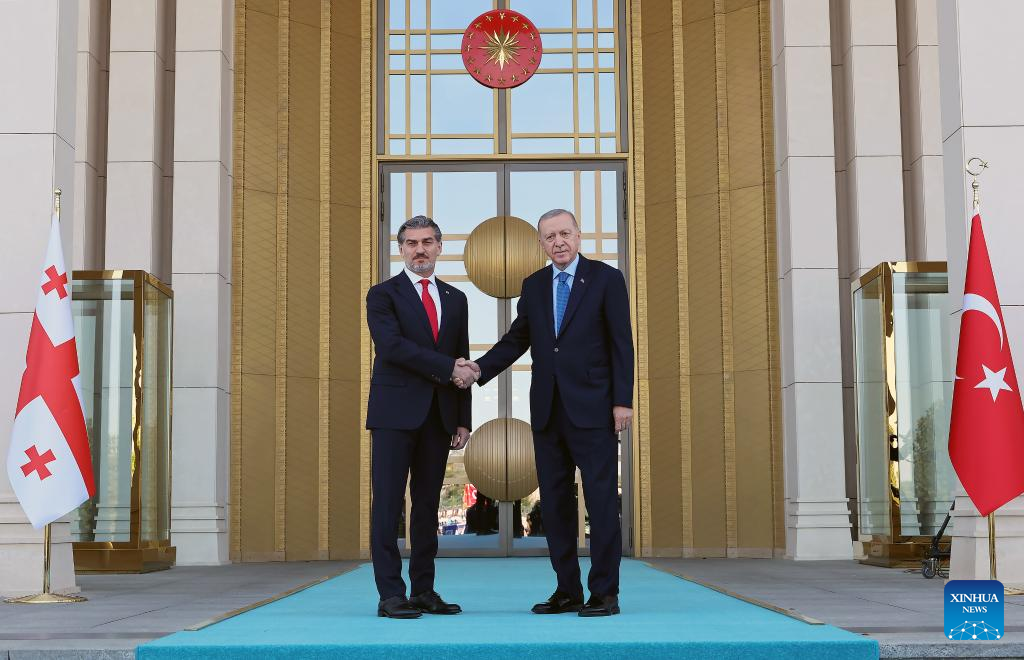 Turkish President Recep Tayyip Erdogan (R) shakes hands with Georgian President Mikheil Kavelashvili during a welcome ceremony in Ankara, Türkiye, on Aug. 12, 2025. Türkiye and Georgia will continue to work "shoulder to shoulder" for regional cooperation, peace and development, Turkish President Recep Tayyip Erdogan said Tuesday. (Mustafa Kaya/Handout via Xinhua)